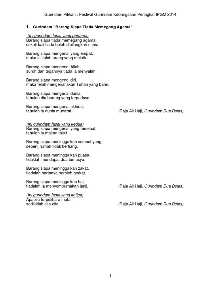 ڬوريندام دوا بلس merupakan puisi hasil karya Raja Ali Haji seorang sastrawan dan Pahlawan Nasional dari Pulau Penyengat Provinsi Kepulauan Riau. Contoh gurindam berikut ini kami hadirkan pengertian ciri dan contoh gurindam lengkap terbaru 2013 gurindam 12pengertua gurindam adalah puisi melayu lama baik cinta atau kehidupan dan lain lain yang memiliki ciri terdiri dari dua bait tiap bait terdiri dari dua baris kalimat dengan irama yang sama dan merupakan kesatuan yang utuh. - Jumlah kata dalam 1 baris - Jumlah baris dalam.
