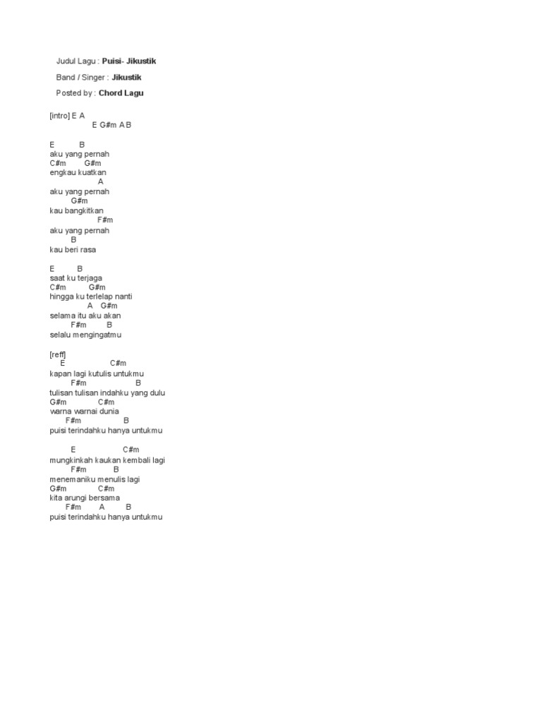 Lirik lagu serta video jikustik mp4 atau 3gp. Feb 11 2014 intro E A E Gm A B E B aku yang pernah Cm Gm engkau kuatkan A aku yang pernah Gm kau bangkitkan Fm aku yang pernah B kau beri rasa E B saat ku terjaga Cm Gm hingga ku terlelap nanti A Gm selama itu aku akan Fm B selalu mengingatmu reff E Cm kapan lagi kutulis untukmu Fm B tulisan tulisan indahku yang dulu Gm Cm warna warnai. All MP3 songs are for personal non-commercial use only.
